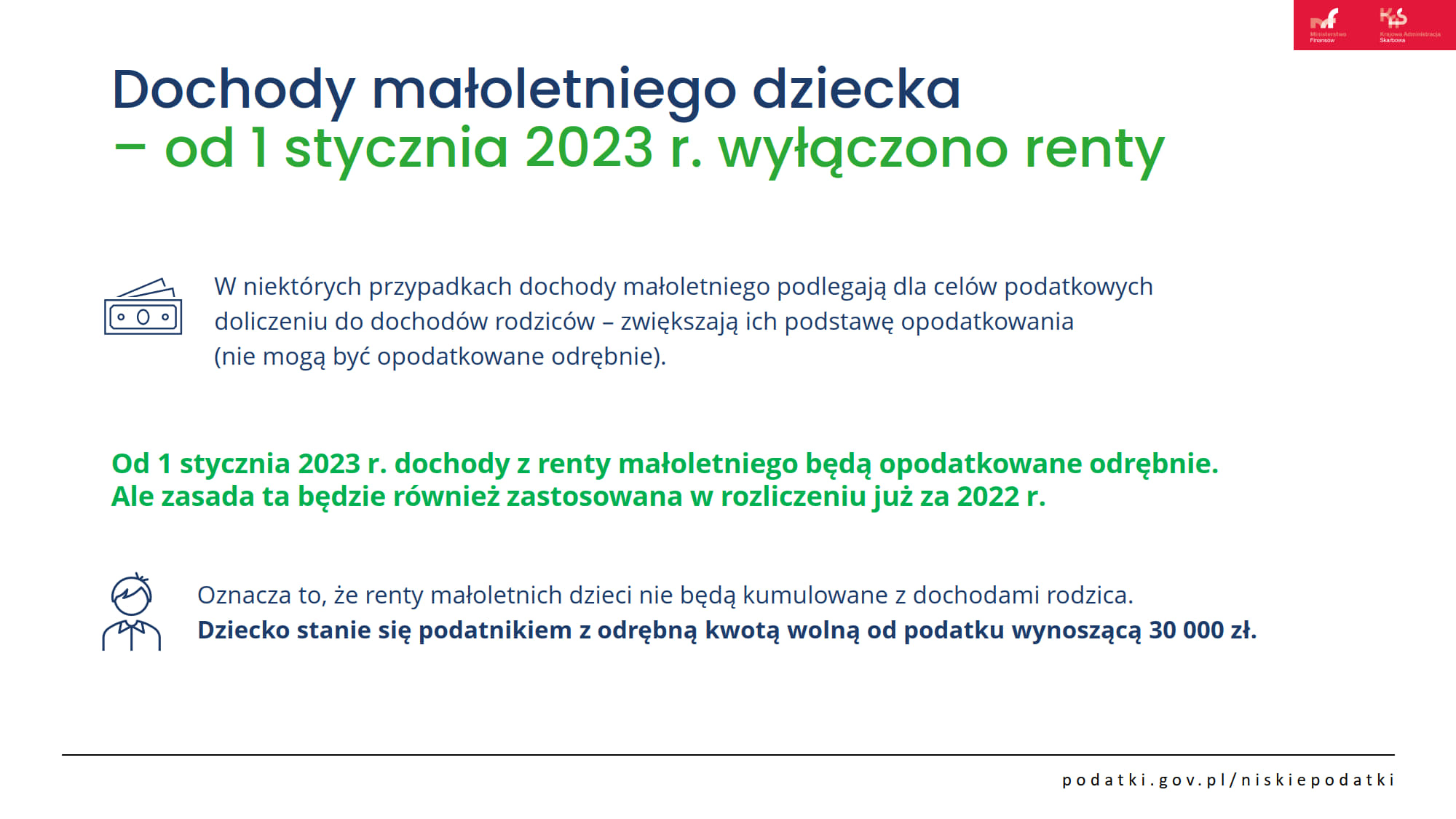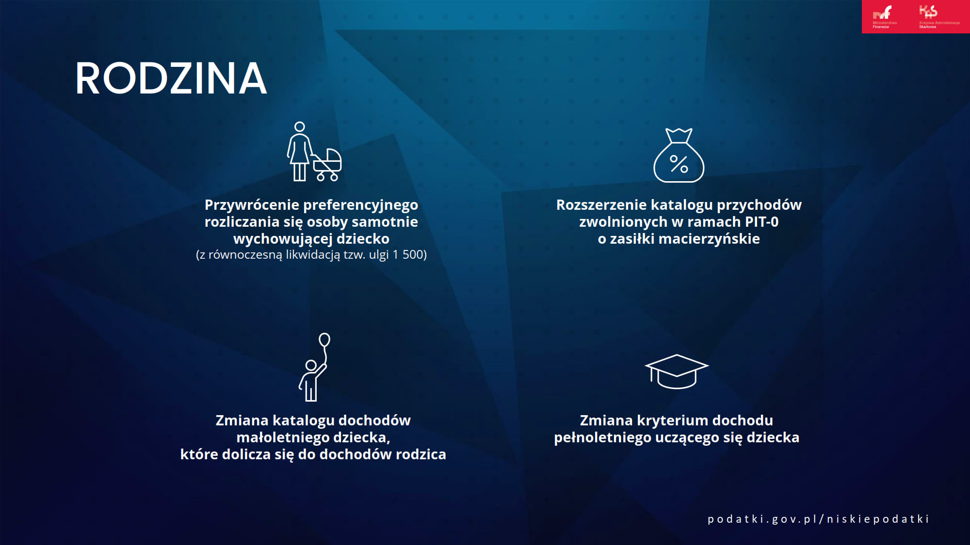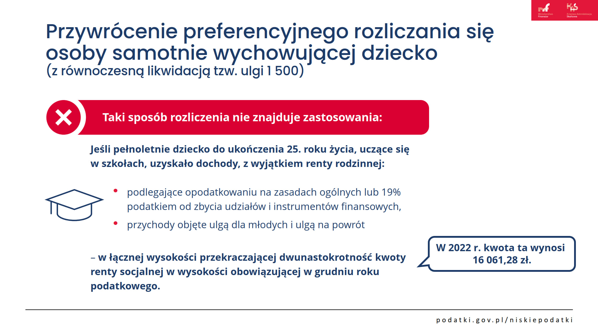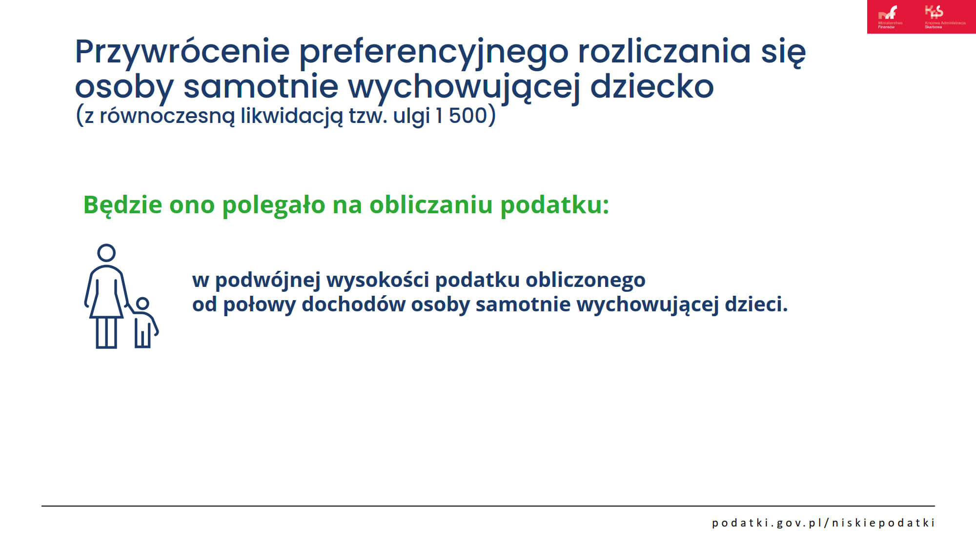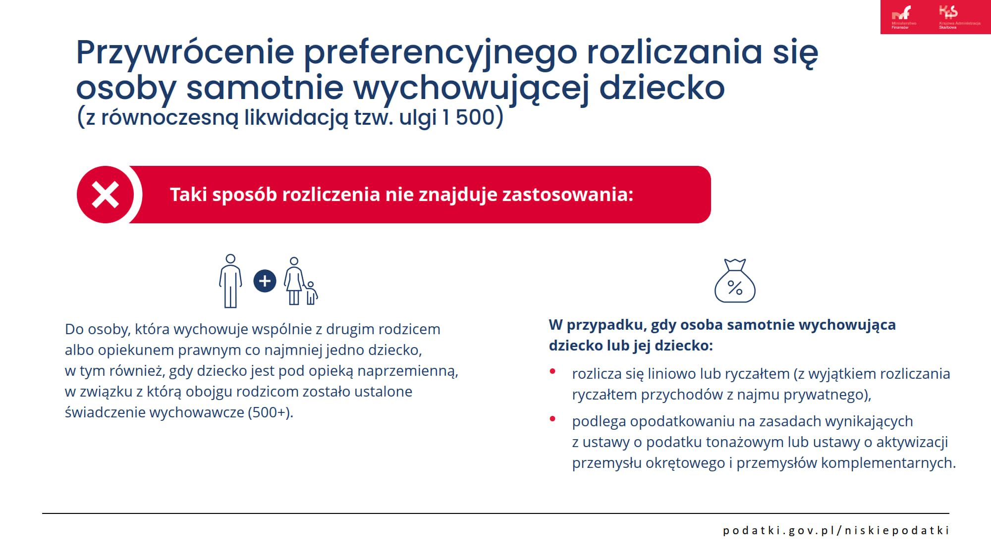 Ustawa Niskie podatki przywraca preferencyjne rozliczenie osób samotnie wychowujących dzieci na zasadach sprzed 2022 r. Z podwójnej kwoty wolnej (60 tysięcy zł) mogą korzystać wszyscy samotni rodzice. Zwiększono limit kwoty dochodów dziecka, który warunkuje skorzystanie z preferencji podatkowych przez rodziców (z 3089 zł do 16 061,28 zł w 2022 r.), a renta rodzinna rozdzielona została od dochodów rodzica, dzięki czemu dziecko skorzysta z „własnej” kwoty wolnej.