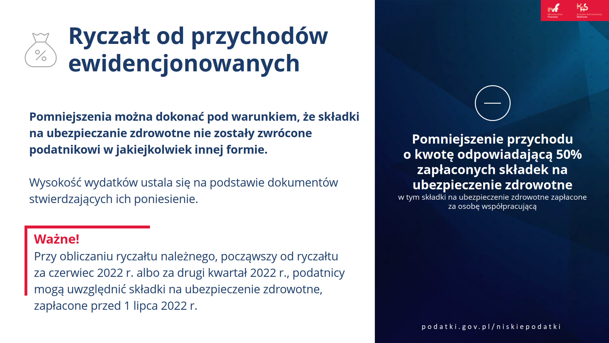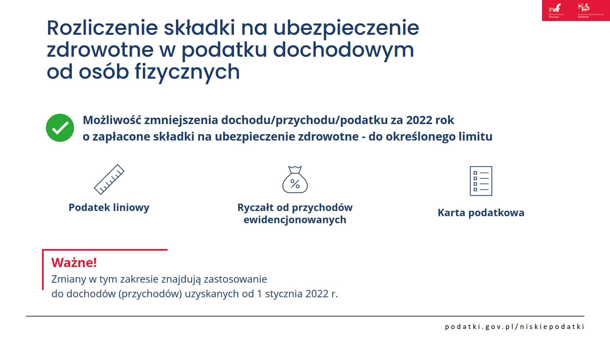 - możliwość rozliczenia części składek zdrowotnych w podatku dochodowym przez przedsiębiorców na podatku liniowym, ryczałcie i karcie podatkowej;